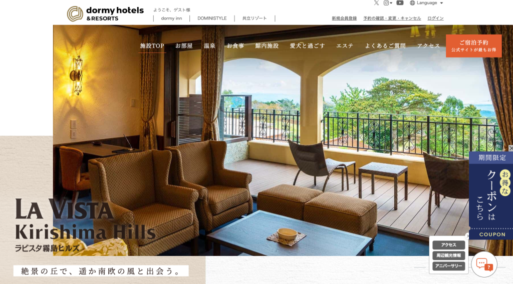 ラビスタ霧島ヒルズ」は、南欧風の贅沢な設えと、鹿児島の自然が融合したプレミアムなホテルです。和のイメージが強い鹿児島で、あえて洋風のラグジュアリーな空間から「日本の春」を眺めるギャップが人気を呼んでいます。