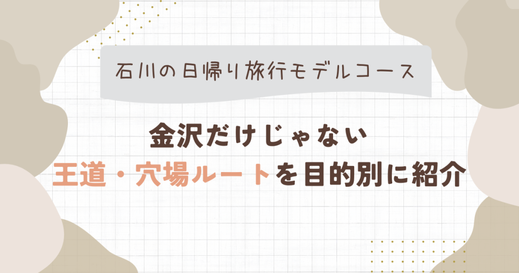 石川県の日帰り旅行と聞くと、「金沢観光」が真っ先に思い浮かぶ方が多いかもしれません。 兼六園やひがし茶屋街、近江町市場など、見どころが集まる金沢は、確かに日帰りでも満足度の高い旅先です。ただ一方で、「金沢だけで終わるのは少しもったいない」... -