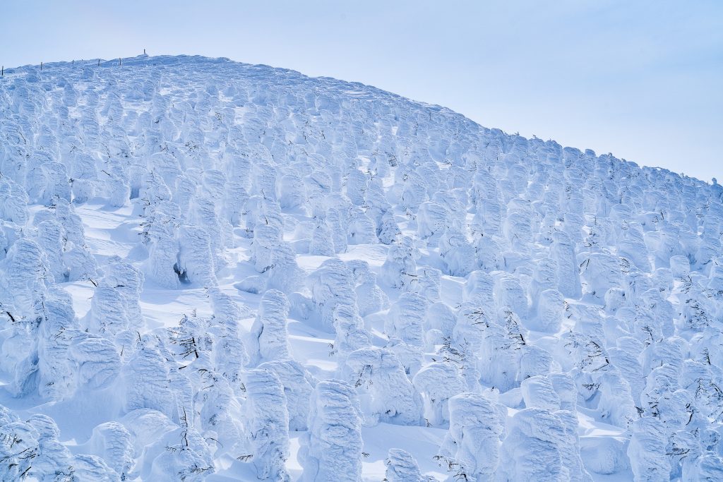 シベリアから吹きつける冷風がアオモリトドマツに雪を付着させ、巨大な“スノーモンスター”を作り出します。