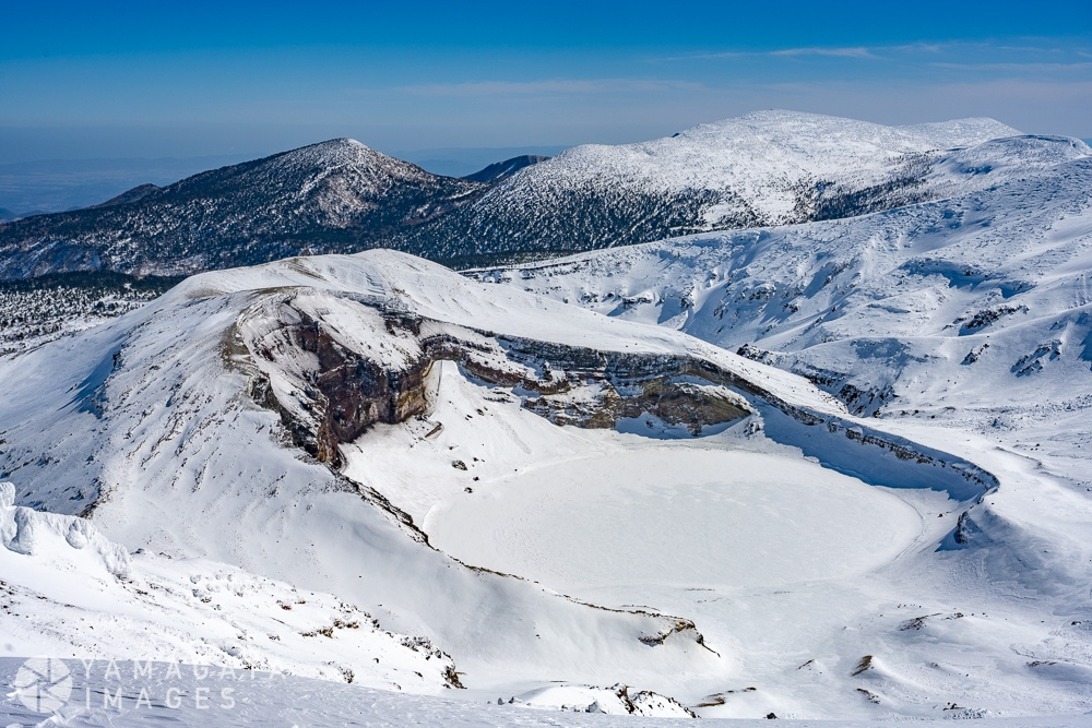 直径約300m、深さ約25mの円形カルデラ湖で、冬は雪に閉ざされて神秘的な白の世界へ。
