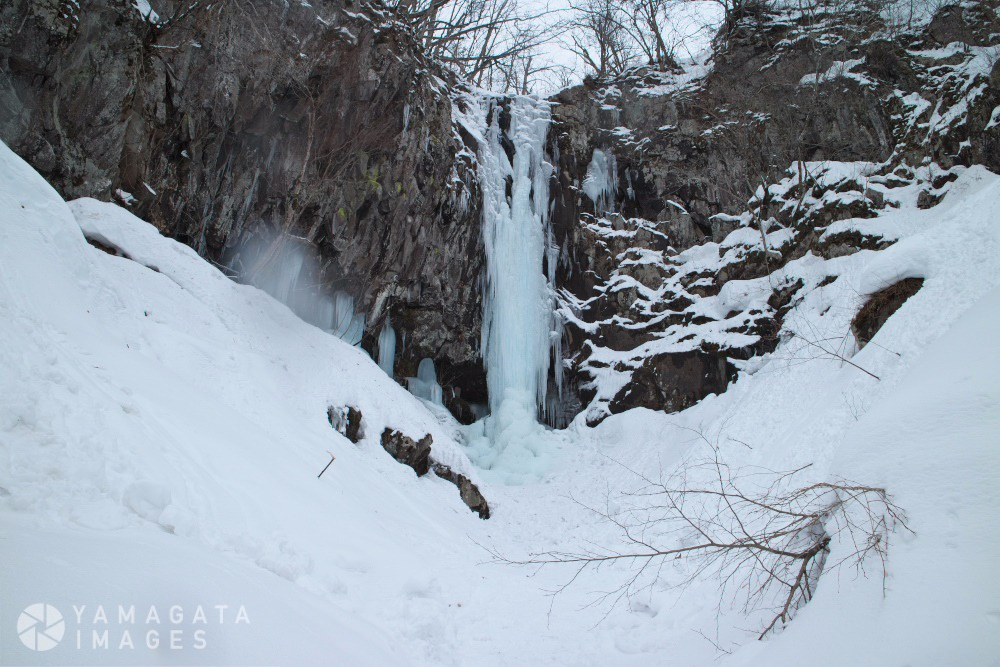 蔵王温泉スキー場の南側に位置し、冬の沢筋に形成される氷の壁は高さ30〜40m、幅50mを超えるスケール。一面が青く透き通る氷で覆われ、まるで氷の宮殿のような空間が広がります。